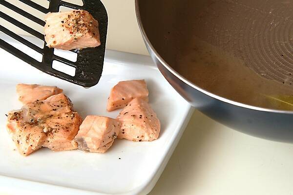 フライパンに鮭と<調味料>を入れて中火にかけ、煮立てば蓋をして2~3分蒸し焼きにし、いったん取り出す。