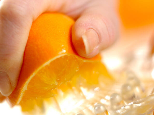 <オレンジ果汁>を作る。オレンジは横半分に切って30ml搾り、ホワイトキュラソーを合わせる。