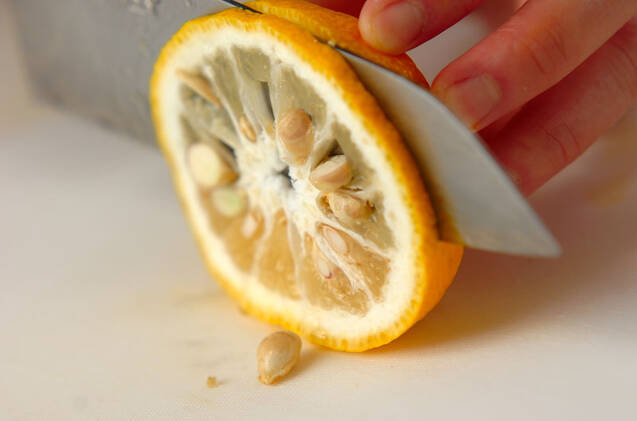 ユズは皮ごときれいに水洗いして横半分に切り、切り口から1枚ずつ輪切りを取る。残りは搾ってユズ汁を取る。