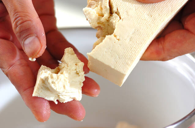 鍋にゴマ油を熱し、木綿豆腐を手で崩しながら入れて炒める。