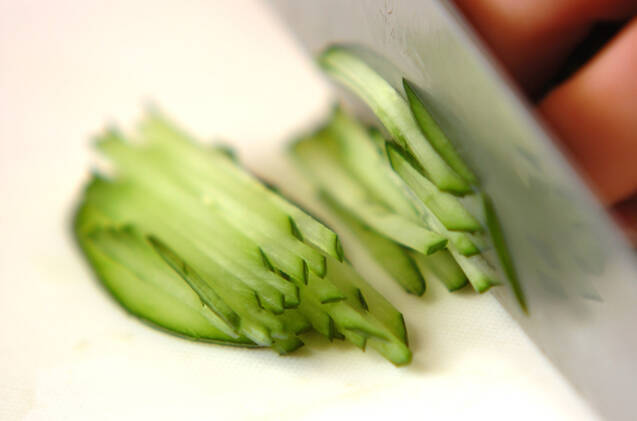キュウリは斜め薄切りにし、さらに細切りにする。