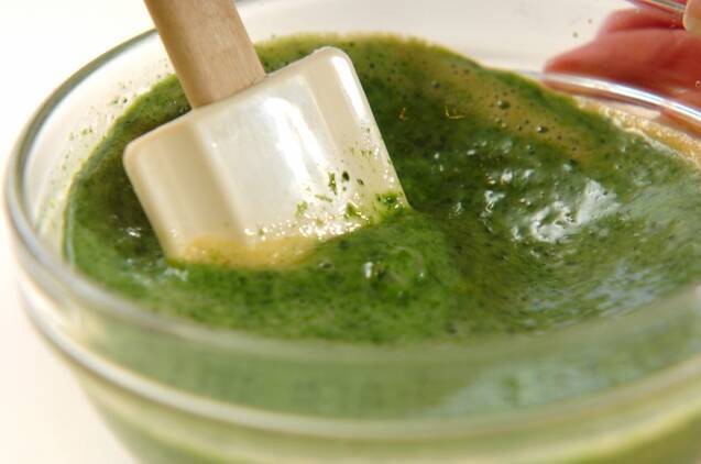 ホウレン草を牛乳と共にミキサーに入れてかくはんする。ボウルに移し、溶き卵を加えてゴムベラで混ぜ合わせる。