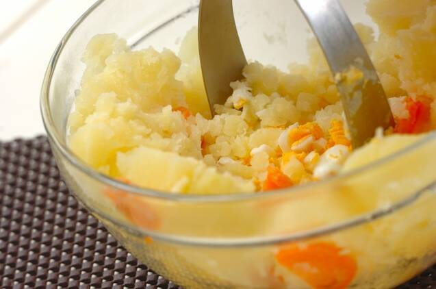 ゆで卵はアルミホイルから出し、水につけて粗熱が取れれば殻をむき、ジャガイモと合わせ、マッシャーでつぶし<下味>をからめる。