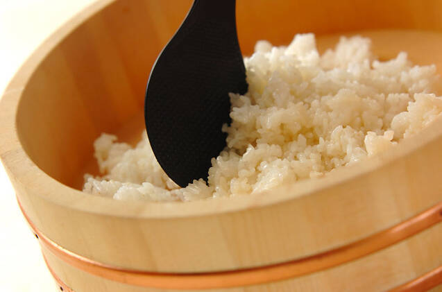 かたく絞った布巾で飯台を拭き、炊きたてのご飯をあけて<合わせ酢>を回しかけ、ご飯に縦に切れ目を入れ、手早く底から返しながら切るように混ぜる。飯台に広げて冷ます。
