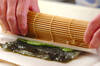 (2)の表面全体に白ゴマを振り、軽く押さえて焼きのりの両端を持って裏返し、焼きのりの中心にサラダ菜、アボカド、ツナ、マヨネーズをのせる。