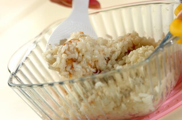 一度取り出し、全体を混ぜ合わせたらさらに3分加熱し、全体を混ぜ合わせる。