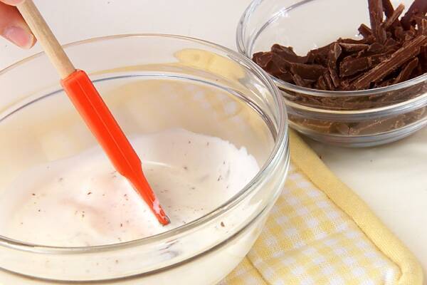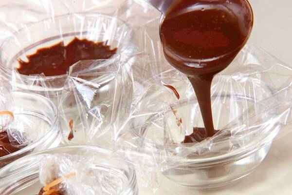 <ガナッシュ>をつくる。耐熱ボウルに生クリームを入れ、電子レンジで30~40秒温め、刻んだチョコレートを加えて溶かす。粗熱が取れればホワイトキュラソーを混ぜ合わせ、ラップに包んで冷蔵庫で固める。