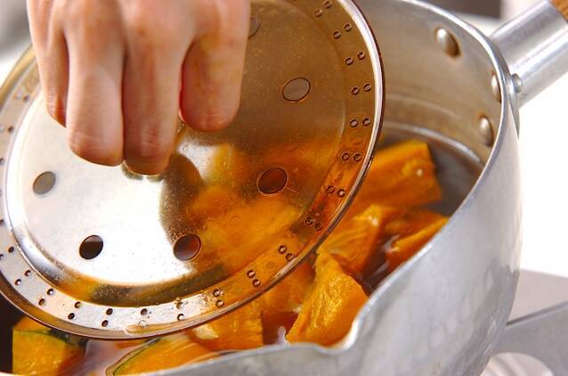 鍋にカボチャ、だし汁、<調味料>を加え、落とし蓋、鍋の蓋をして強火にかける。煮立ったら火を弱め、15分煮る。