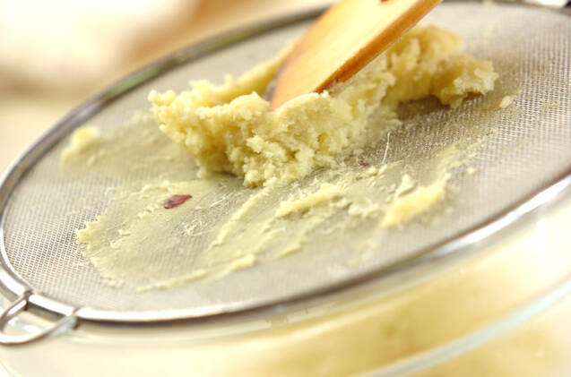 サツマイモは蒸し器で竹串がスッと刺さるまで蒸し、皮をむいて裏ごしする。