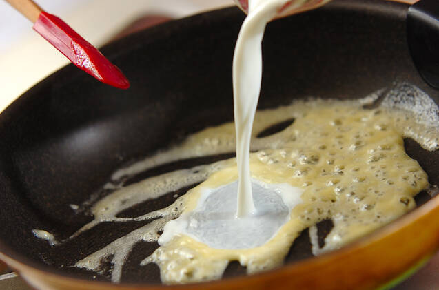 フツフツと泡が出てきたら、牛乳を少しずつ加えてよく混ぜ合わせる。トロミがついてきたら顆粒スープの素を加えて混ぜる。
