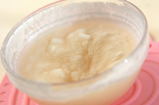 <生地>を作る。白玉粉とシロップを、白玉粉の粒がなくなるまで混ぜる。電子レンジで1分加熱して、均一に混ぜる。さらに1分加熱して、しっかりと混ぜる。