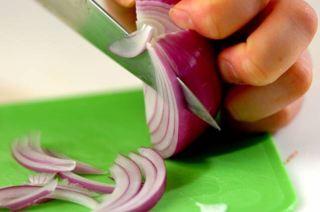紫玉ネギは繊維に沿って薄切りにし、水にさらして水気をきる。
