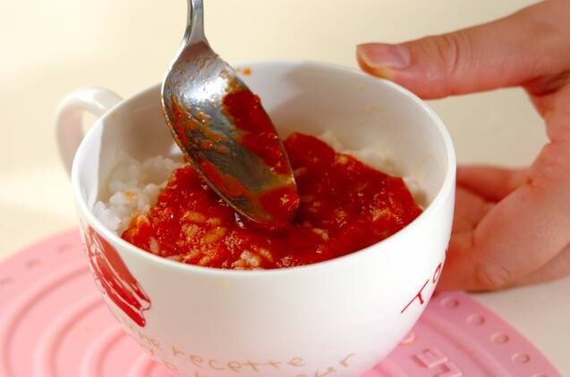 マグカップの内側にEVオリーブ油を少々ぬり、ご飯を入れる。その上にトマトソースをのばし、ピザ用チーズをのせる。