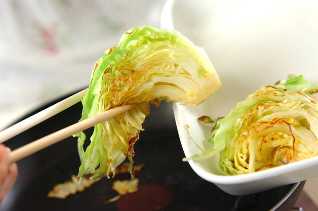 フライパンにサラダ油小さじ1.5を熱し、キャベツを並べ入れ、両面に焼き色がつくまで焼き、いったん取り出す。