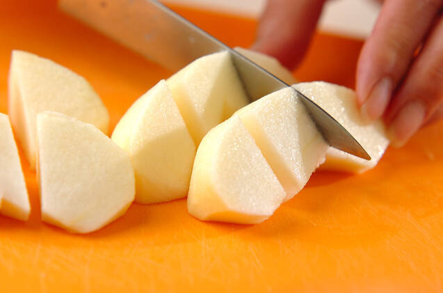 リンゴは皮をむいて芯を取り、ひとくち大に切る。