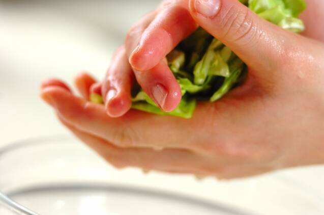 キャベツとリンゴ、キュウリに塩少々をまぶし、10分ほど置く。しんなりしたら手でしっかり絞って水気をきり、キッチンペーパーなどで水分を拭く。