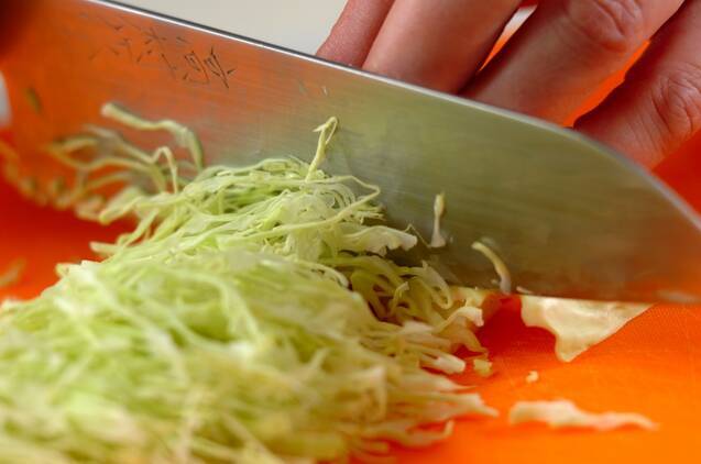 キャベツはせん切りにし、サッと水に放つ。ザルに上げ、水気をしっかりきって器に盛る。