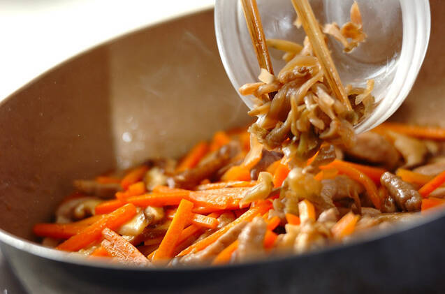 豚もも肉に火が通ったら、ニンジン、シイタケを加えて炒め合わせ、さらにザーサイを加える。