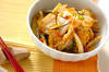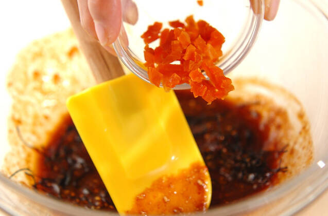 <合わせダレ>の材料をボウルに入れて混ぜ合わせ、アンズ、水気を絞った白菜を加える。全体に混ぜ合わせて、器に盛る。