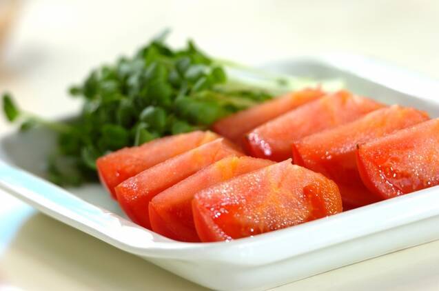 トマトはヘタを取り、8つのくし切りにする。貝われ菜は根元を切り落とす。