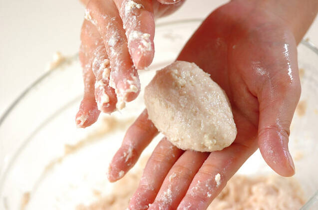 <つくね>の材料をボウルに入れて手で練り混ぜ、6~7等分に分ける。手に分量外のサラダ油を薄くつけ、右手から左手へ、左手から右手へとキャッチボールをするように空気抜きをして、丸型に形を整える。