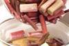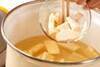 鍋にだし汁とズイキの芋、油揚げを入れ中火にかけ、煮立ったら<調味料>を加えて、芋に竹串がス~ッと刺さる位まで柔らかく煮る。