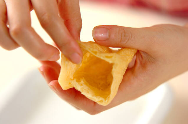 油揚げは半分に切ってほぼ正方形にし、麺棒で軽く押さえながら転がし、熱湯に通して油抜きをする。粗熱が取れたら袋状に開く。白マイタケは4つに分け、サッと熱湯に通す。ニンジンは皮をむき、細切りにする。お餅は4つに切る。