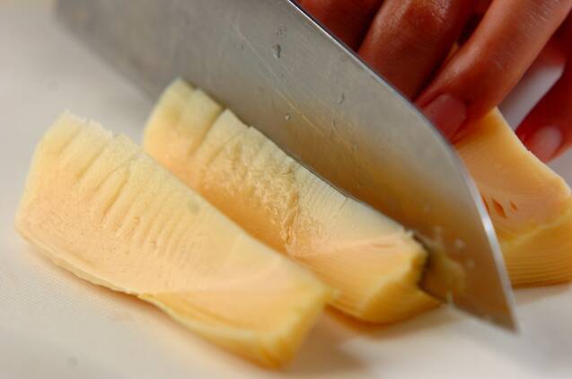 水煮タケノコは食べやすい大きさのくし切りにして水洗いし、水気を拭き取る。