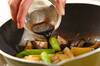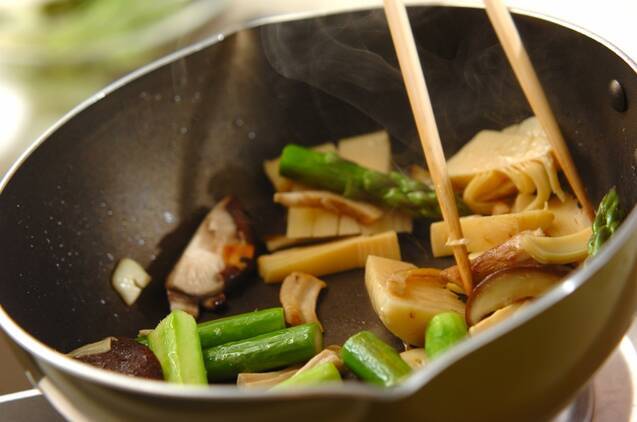 フライパンにEVオリーブ油とニンニクを入れて中火で熱し、香りがたってきたら水煮タケノコ、シイタケ、グリーンアスパラを強火で炒める。