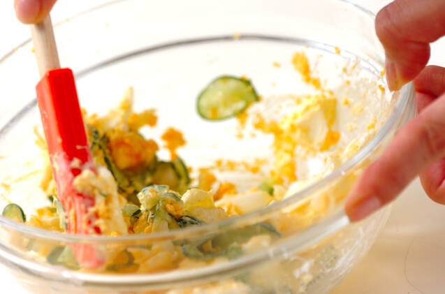 卵をフォークなどで大きめにつぶし、キュウリ、マヨネーズを混ぜ合わせ、ガーリックパウダー、塩コショウを振って味を調える。