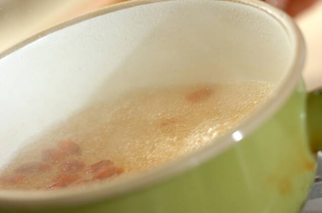 鍋に<スープ>の材料、クコの実を入れて強火で熱し、ひと煮たちさせる。