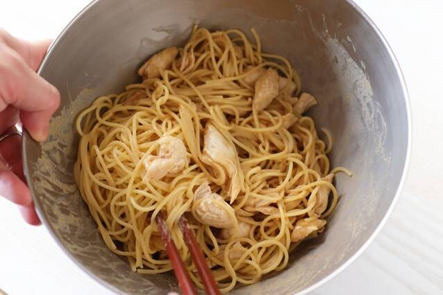 大きめのボウルに(3)のスパゲティーの水気をよく切って入れ、ささ身を手でさいて入れ、<ごまだれ>を混ぜ合わせる。
