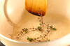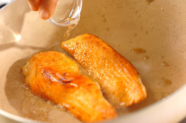 表面においしそうな焼き色がついたら鮭を返し、同様に焼き色がついたら白ワイン、レモン汁を加える。煮たったらフライパンに蓋をし、火を少し弱めて2~3分蒸し焼きにする。