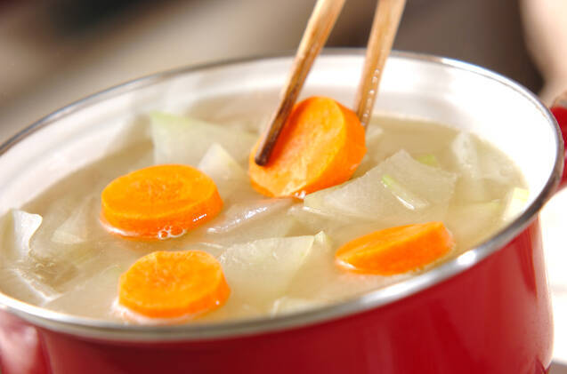 ゆで汁を切った冬瓜、ニンジンを加えて中火にし、煮立ったら<調味料>を加える。再び煮立ったら火を弱めて10分煮る。