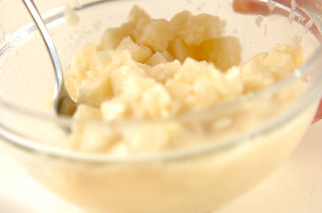 ボウルにジャガイモを入れ、スプーンでよく混ぜ合わせる。