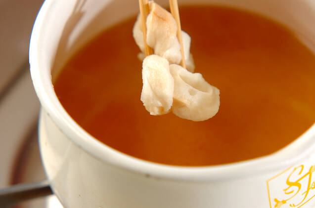 鍋にだし汁を入れて強火にかけ、煮たったら<調味料>の材料、麩を加える。