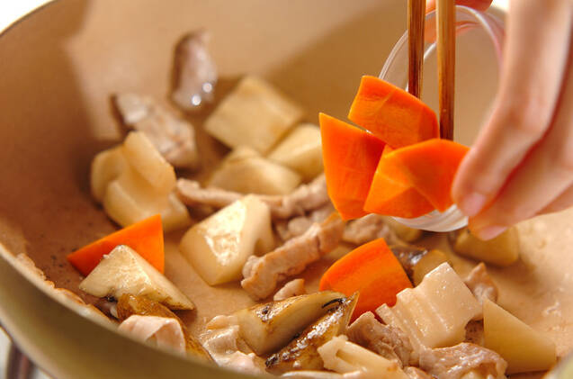 フライパンにゴマ油を強火で熱し、豚肉、水きりしたゴボウとレンコンを加え、全体に炒められたらニンジンを加えて炒め合わせる。