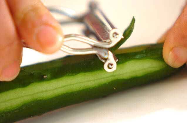 キュウリは両端を切り落とし、ピーラー等で縦じまに皮をむく。