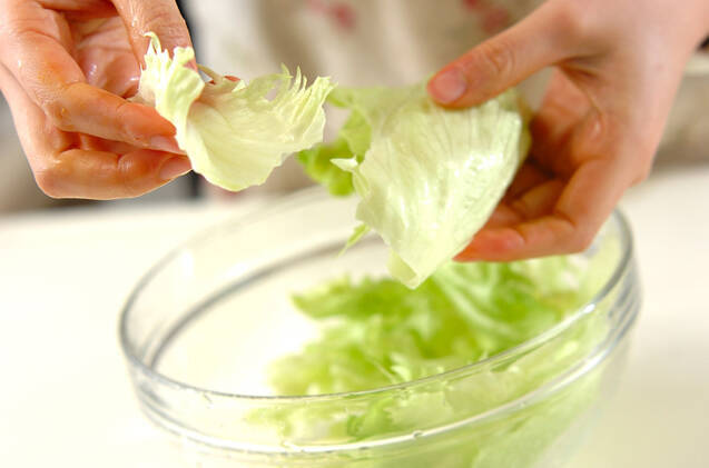 ベーコンは細切りにする。レタスは水に放ち、パリッとしたらザルに上げて水気を拭き取り、ひとくち大にちぎる。玉ネギは縦薄切りにし、辛みが苦手な場合は水に放ってザルに上げ、水気を拭き取る。プチトマトは水洗いしてヘタを取り、半分に切る。ボウルで<ドレッシング>の材料を合わせておく。