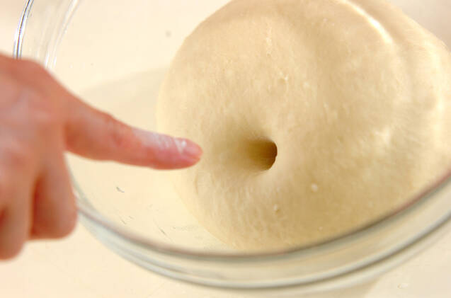 指に分量外の強力粉をつけてパンに穴をあけ、そのままの穴が残るか確認をする(フィンガーテスト)。
