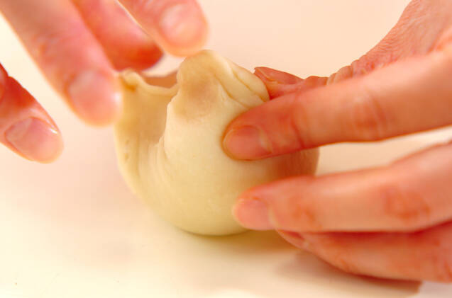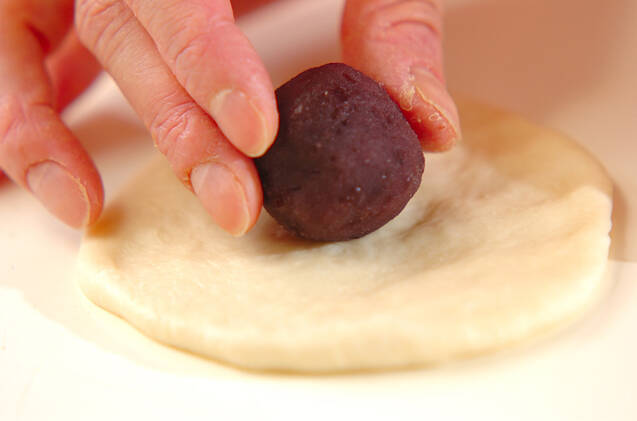 成形する。10cmほどに広げ、真ん中に粒あんをのせ、まるめなおす。