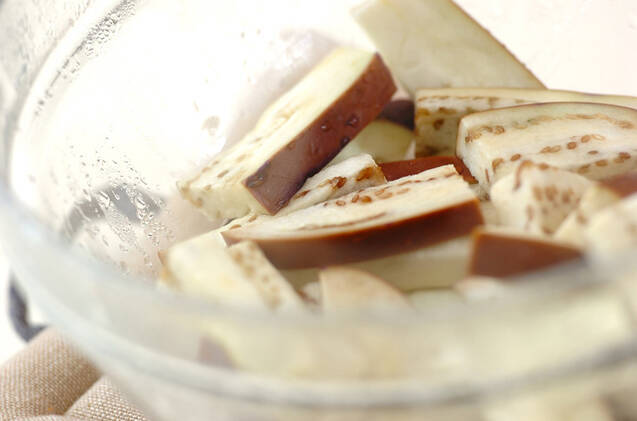 ナスの水気をきって耐熱ボウルに入れ、塩を振って軽く混ぜる。ラップをかけて電子レンジで2~3分加熱し、冷ましておく。電子レンジは600Wを使用しています。