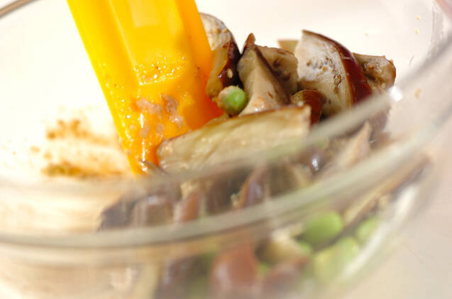 ボウルに<調味料>の材料を混ぜ合わせ、軽く絞ったナスと枝豆を入れて混ぜ、器に盛る。