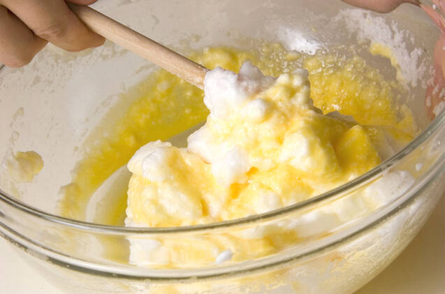 卵黄を泡立てた卵白に加え、泡をつぶさない程度に混ぜ合わせる。
