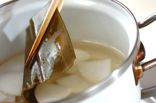 鍋に水、昆布、大根を入れて中火にかける。沸騰直前で昆布を取り出し、ショウガ、酒、塩、みりんを加える。