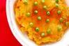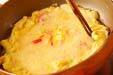 小さいフライパンにサラダ油大2を熱して2を流し入れ、大きく手早く混ぜ、半熟状になれば卵の周囲を少し内側へ折り曲げ、丸く形を整える。