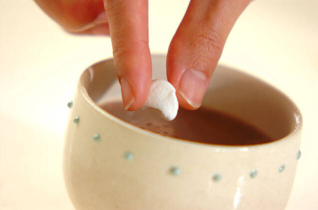 カップに注いでマシュマロをのせ、仕上げに分量外のココアパウダーを振る。
