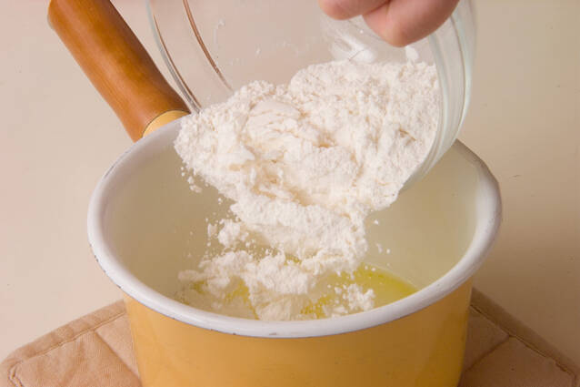 薄力粉、強力粉は合わせて振るっておく。鍋に水、牛乳、塩、砂糖、バターを入れ、混ぜながら1度煮立てる。火からおろし振るった粉を一気に加え、力を入れながら手早く生地がまとまるまで木べらで練る。