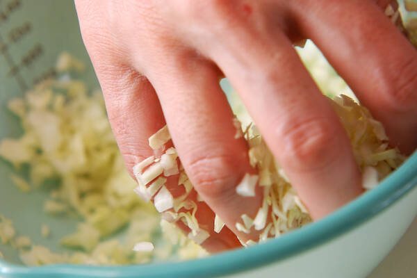<豚キャベツ種>のキャベツはみじん切りにし、塩でよくもむ。しんなりすれば水気を絞り豚ひき肉を加えて粘りが出るまでよく練り合わせ、片栗粉を混ぜ合わせる。