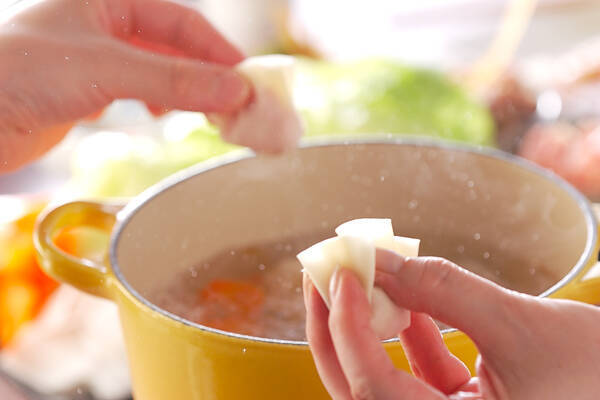 餃子の皮の中央に具をのせ、のり代わりの水をつけ、空気を入れないように半分にギュッと押さえて止める。煮立ったスープに餃子を入れ、浮いてきたら少し煮て、煮えたものから、タレにつけていただく。